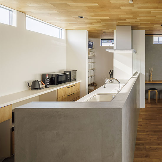 また、外部からの視線を遮るべく、中庭部分の壁の高さを調整し、カーテンの要らない生活を実現しました。外観の無機質な印象とは対照的に、キッチン部分にはコンクリート素材と木をふんだんに使い、シャープながら温かみのある空間とすることで、帰りたくなる我が家を実現しました。