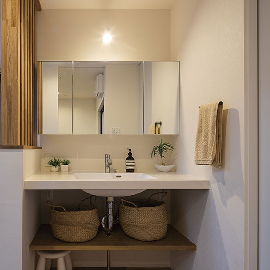また、プライバシーを守るために格子の形状を菱形にするなど細部にもこだわりました。外観は周囲との調和を考えリシン吹付と木の組合せを採用し、斬新な形とは裏腹に落ち着いた飽きのこない和モダンテイストに仕上げました。漆喰の白い壁が上品で洗練された印象を与えます。また、断熱材にはセルロースファイバーを採用し、防音効果も高めています。