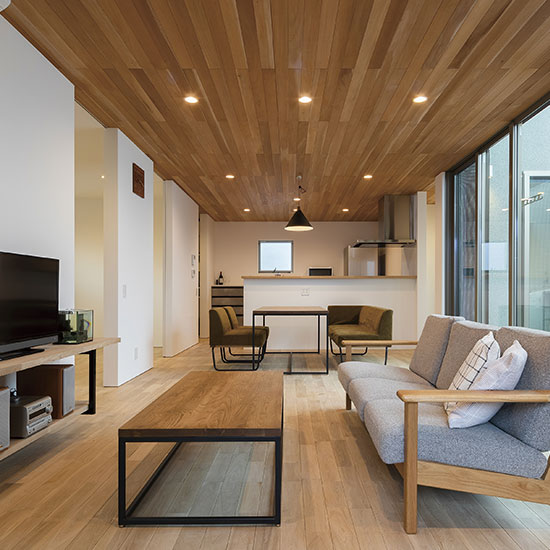 床と天井にはナラの無垢材を採用し、シックな佇まいの外観からは想像できない温かみのある室内となりました。家のどこにいても家族が繋がる、かけがえのない我が家です。