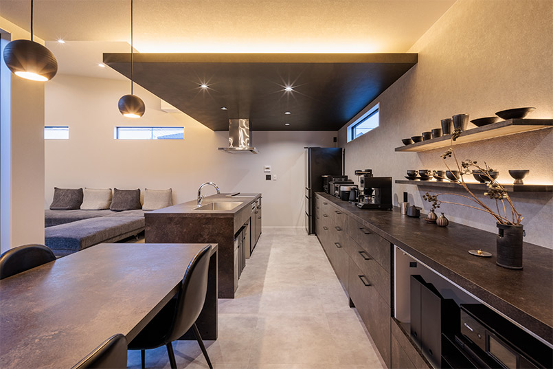 また、外部からの視線を遮るべく、中庭部分の壁の高さを調整し、カーテンの要らない生活を実現しました。外観の無機質な印象とは対照的に、キッチン部分にはコンクリート素材と木をふんだんに使い、シャープながら温かみのある空間とすることで、帰りたくなる我が家を実現しました。
