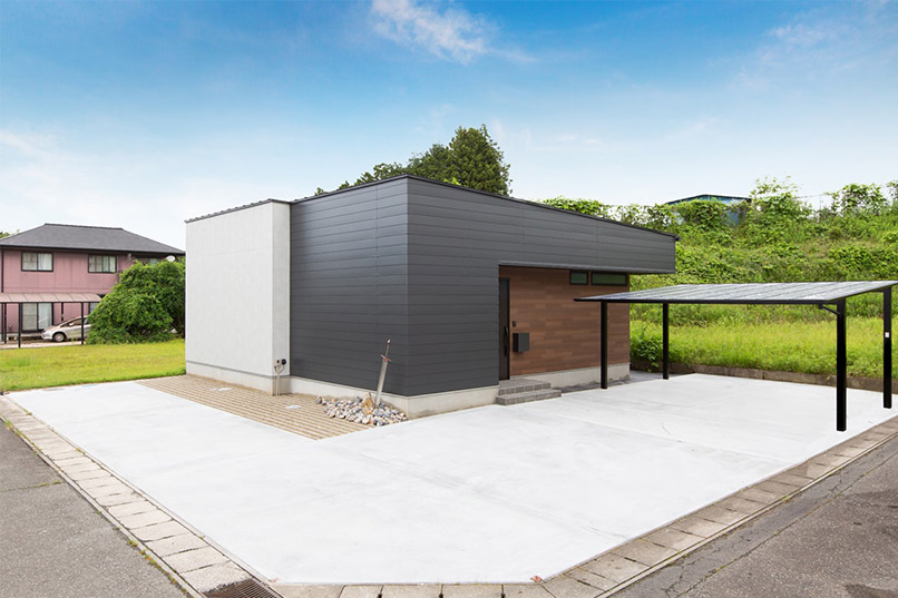 厚みのある石張風の外壁とガルバリウムを使い、素材感の違いでインパクトのある外観に。内装も床材に無垢のアカシア、アクセントにコンクリート風の壁を使い、落ち着いた飽きのこないインテリアも印象的です。