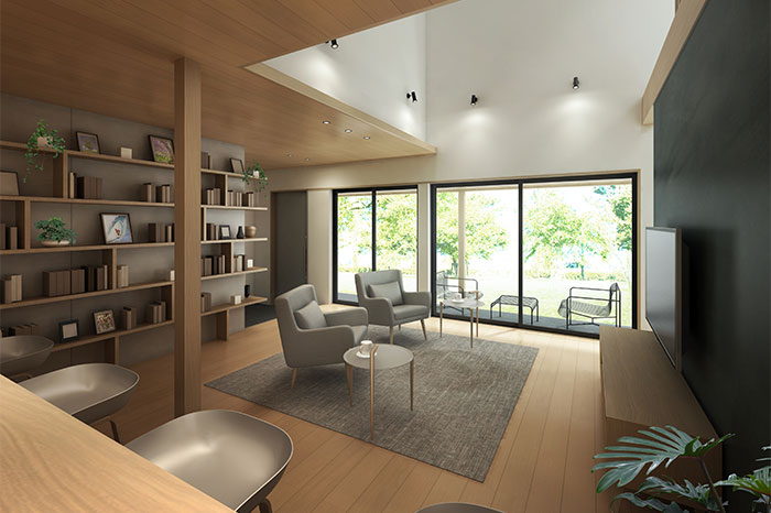 親しい人たちを招いてお茶会や食事会など、さまざまなシーンに対応可能なクラシカルなスタイルの家です。テラスによって室内外がゆるやかにつながり、アイデア次第で色々な楽しみ方が可能に。開放的な空間はコミュニティの中心になることが期待できます。軒は出さずにすっきりとした三角屋根と南面に大きく開放された窓が特徴です。奥行のあるリビング前のテラスが内と外をゆるやかにつなぎます。