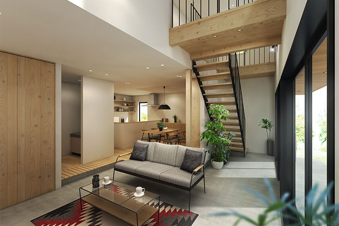 多様な用途に使える土間を室内空間へ取り入れたプランです。