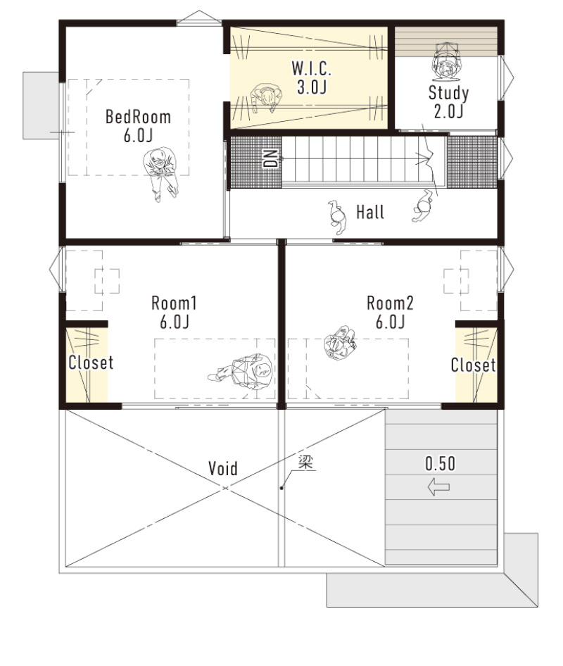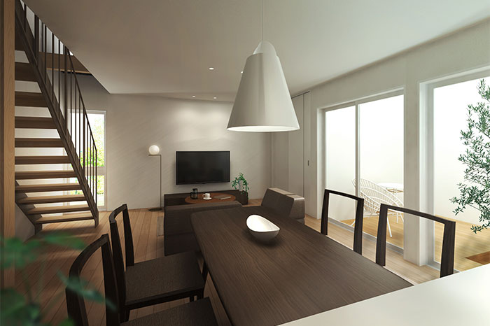 周辺環境を気にすることなく屋外を一体化できるスタイルの家です。趣味に没頭したり、家族や友人と自由な時間を過ごしたり、外から見えない中庭はまるで第二のリビング。自然の中で四季の移ろいを感じることができ、日々の生活がより豊かで充実したものに。外からは中庭が見えないフラットな箱型のファサード。正面の横ラインのサッシとシャープでスッキリとした玄関庇が外観のアクセントです。